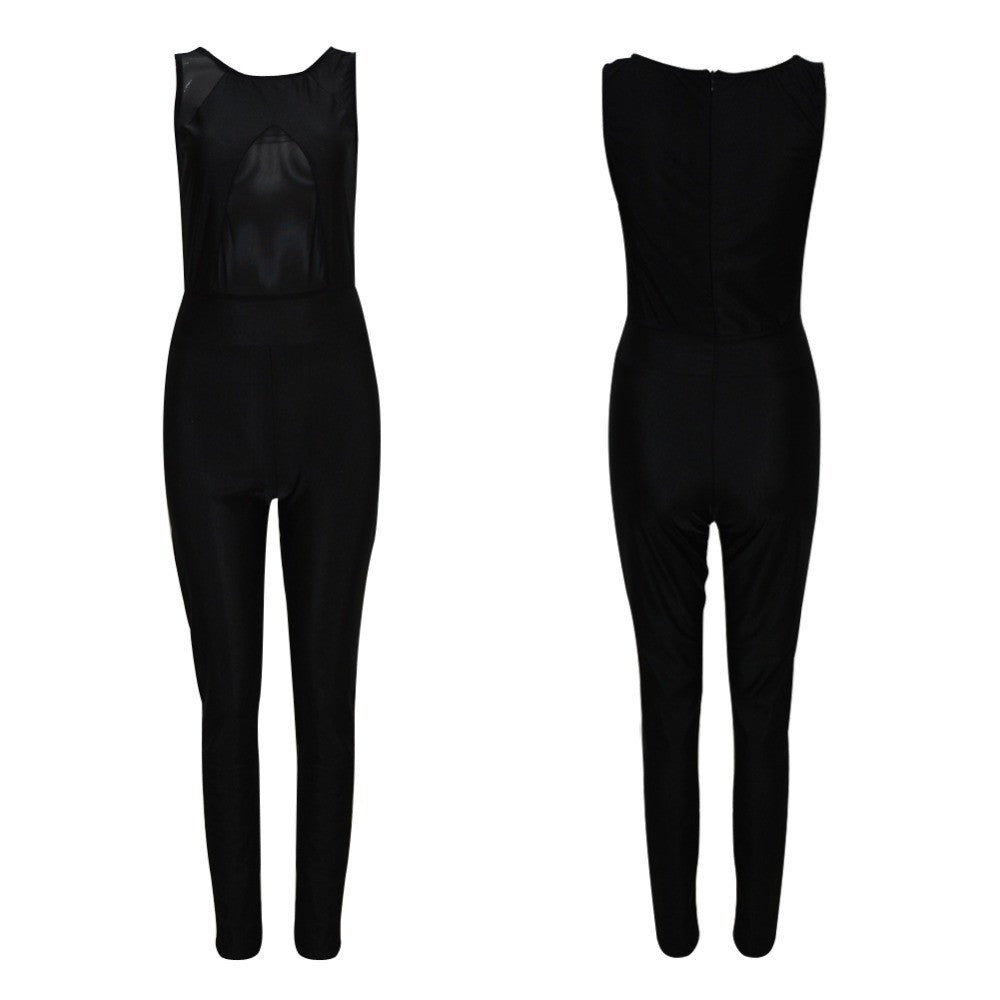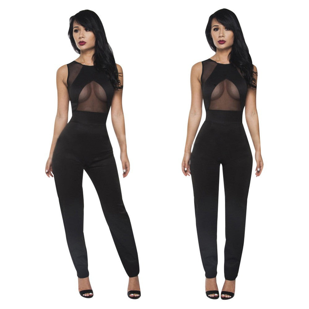 Backless Sleeveless Splicing Lace Transparent Waist Jumpsuit Pants Bodysuit Playsuit Rompers Black 1STL ELY