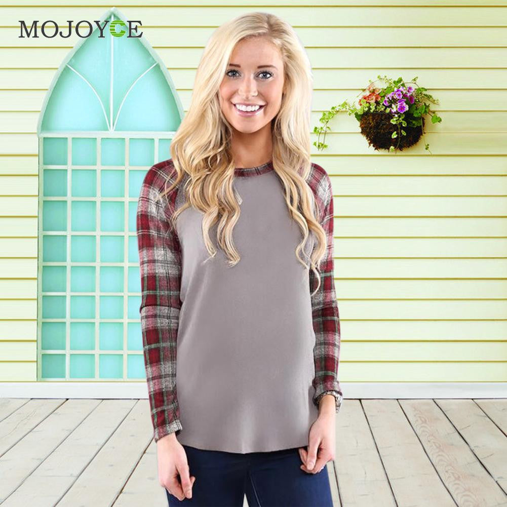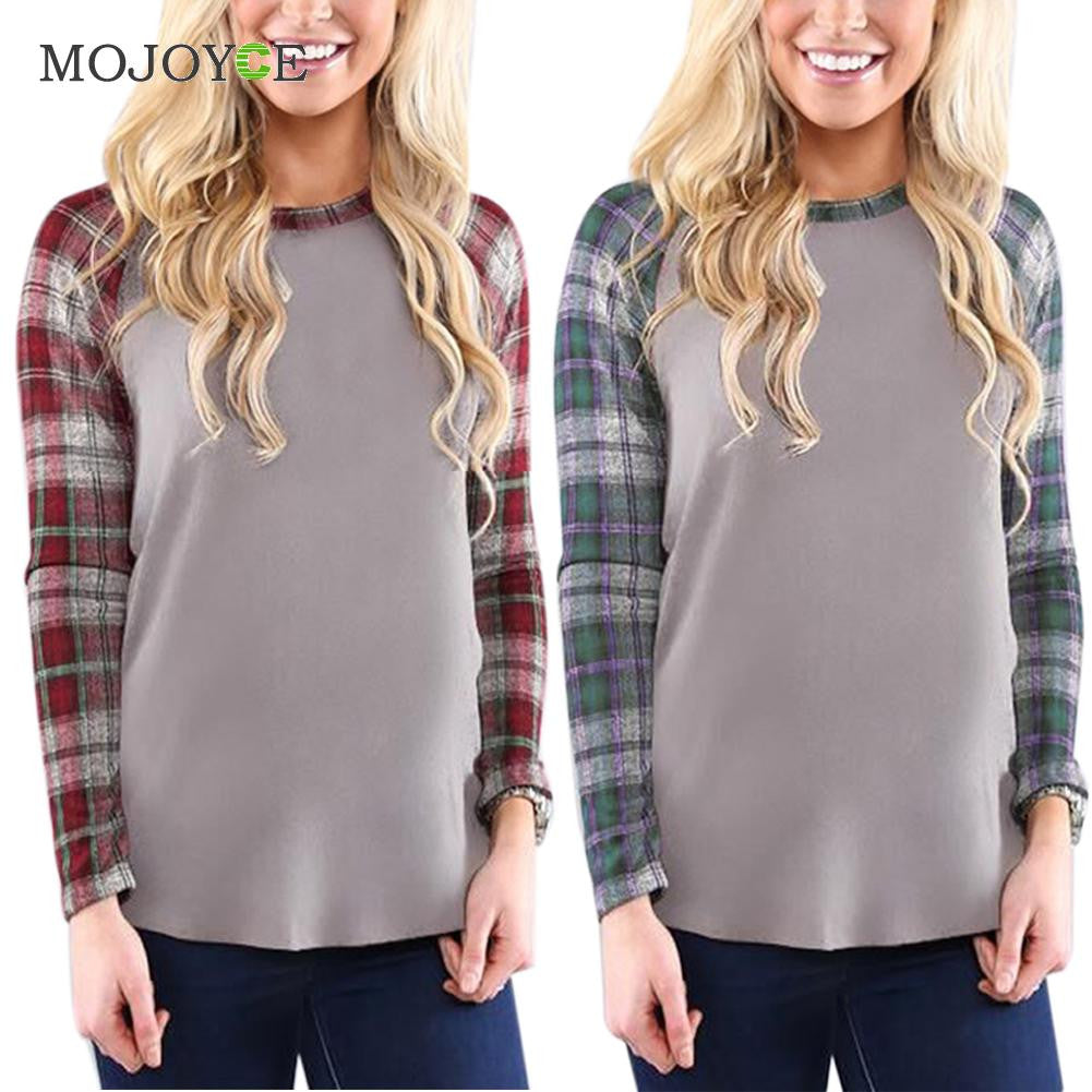 Casual Round Neck T Shirt Women Tops Plaids Check Blusa Long Sleeve T Shirt Plus Size 1STL ELY