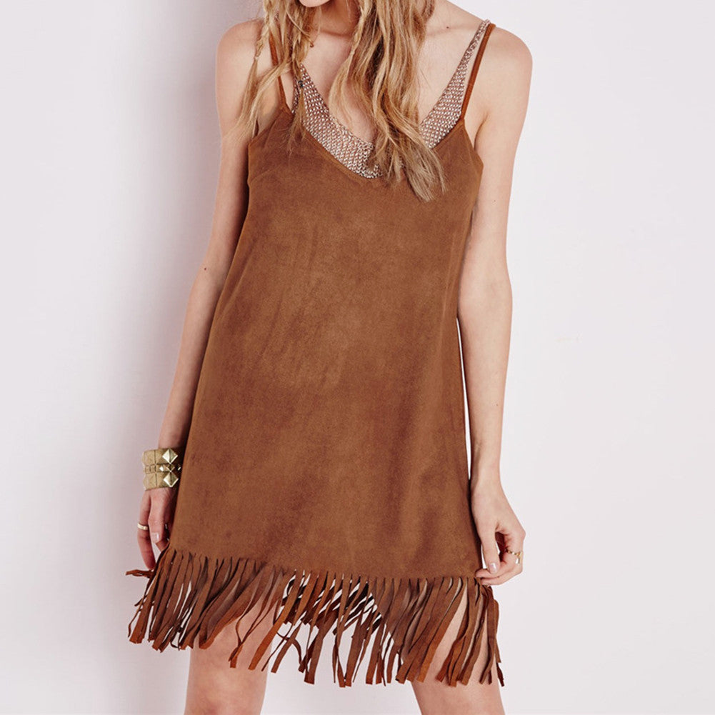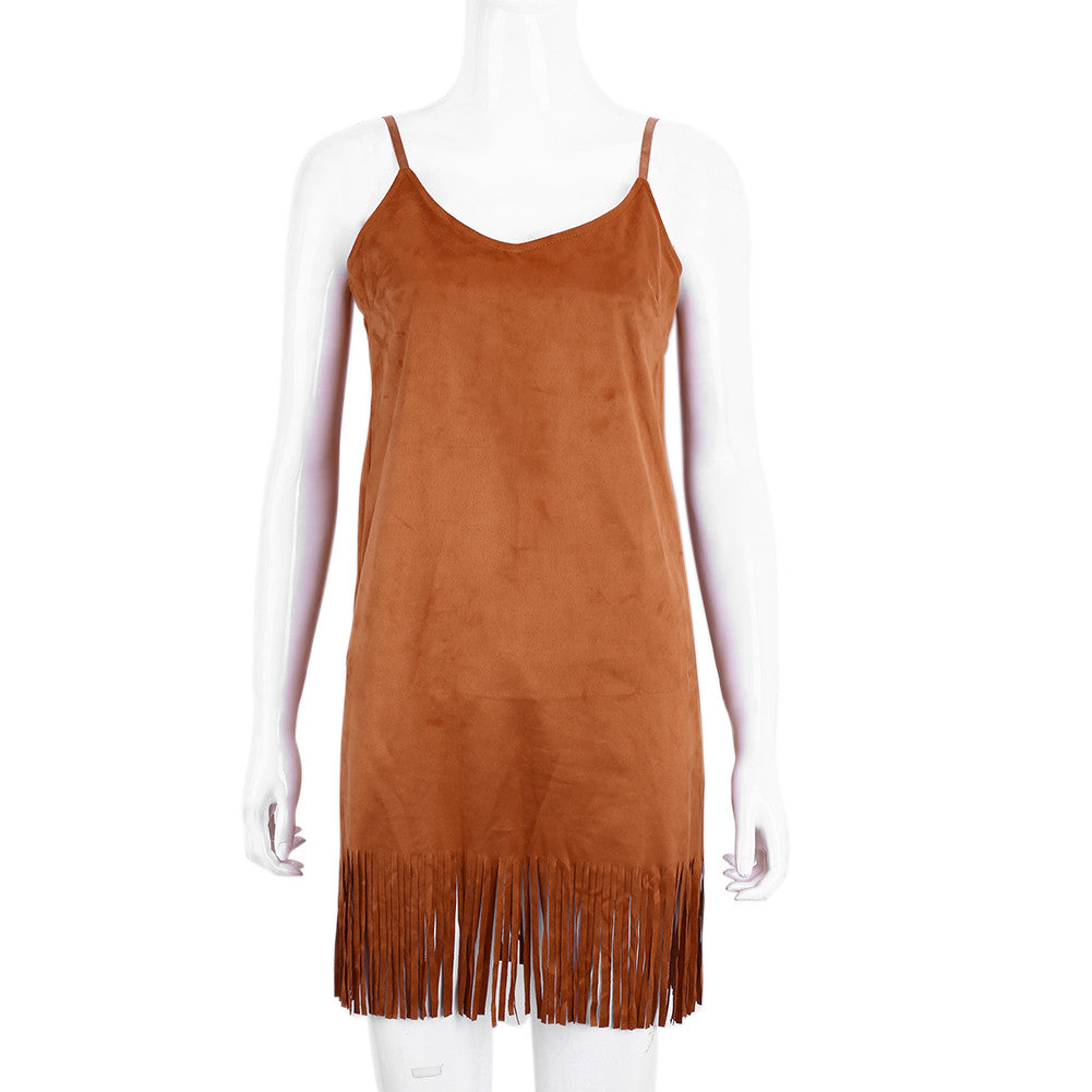 Casual Slim Backless Tassels Suede Fabric Sleeveless Vest Dress Camisole Spaghetti Strap Long Tank Dress Brown Women Vestidos ELY