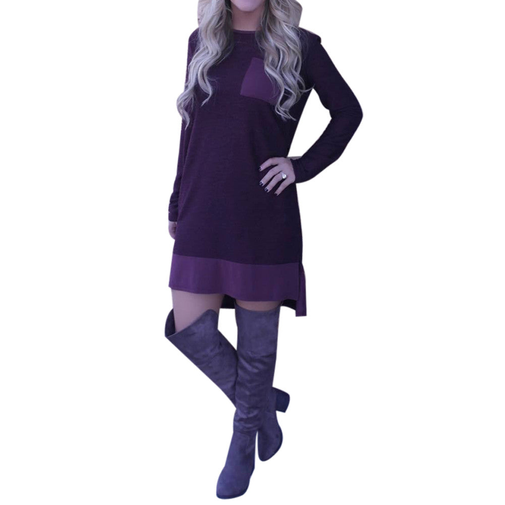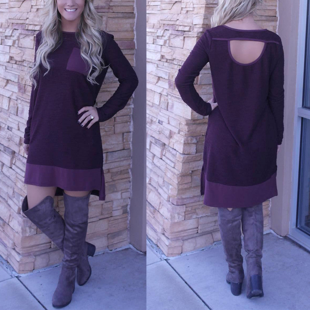 Casual Stitching Backless Women Dress Vestido O-Neck Splice Long Sleeved Dress Purple Dress Vestido De Festa ELY