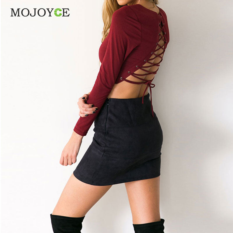 Cotton T shirt Women Blusa Long Sleeve Cross Strap Backless Cropped Sexy Tops T shirt Crop Top Burgundy Black Tees ELY