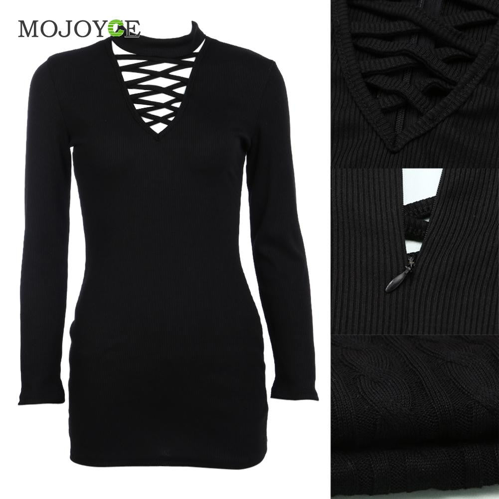 Cross Bandage Plunge Dress Vestidos V-Neck Punk Long Sleeve Mini Women Dress Bandage Dress Vestidos De Fiesta ELY
