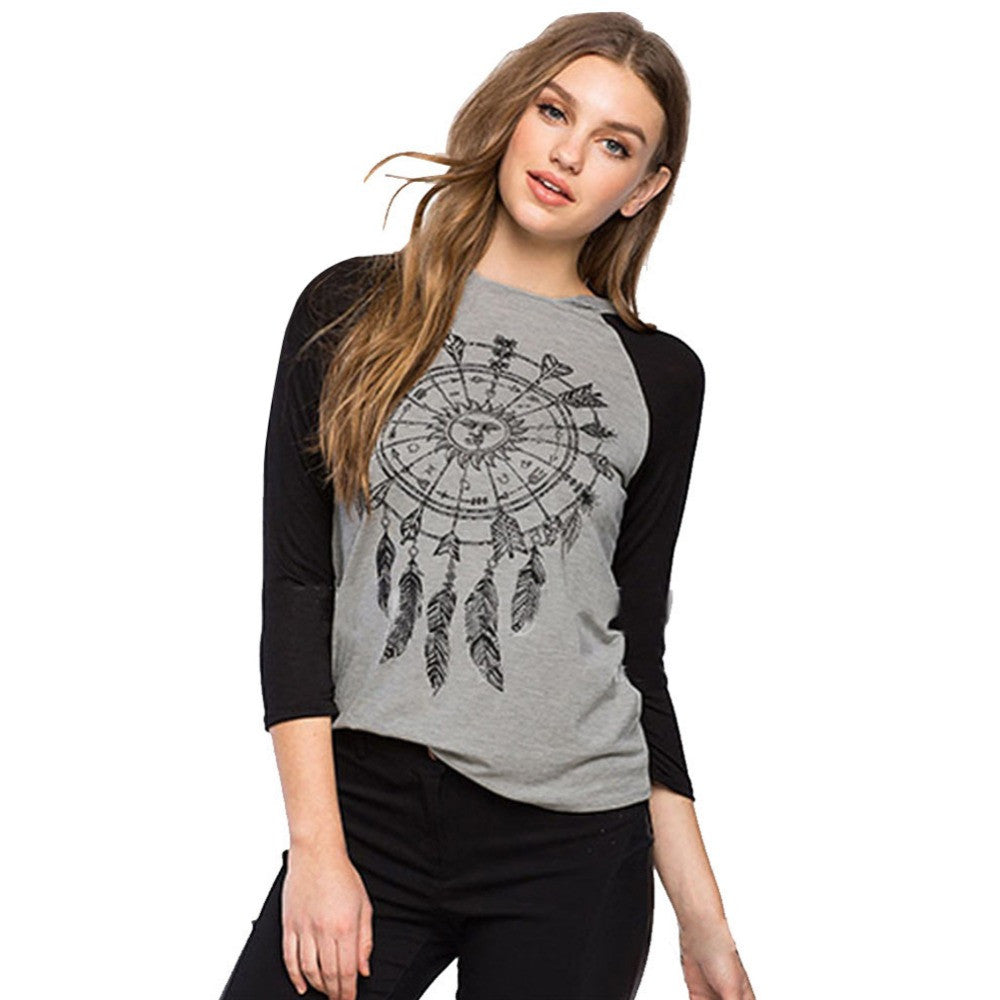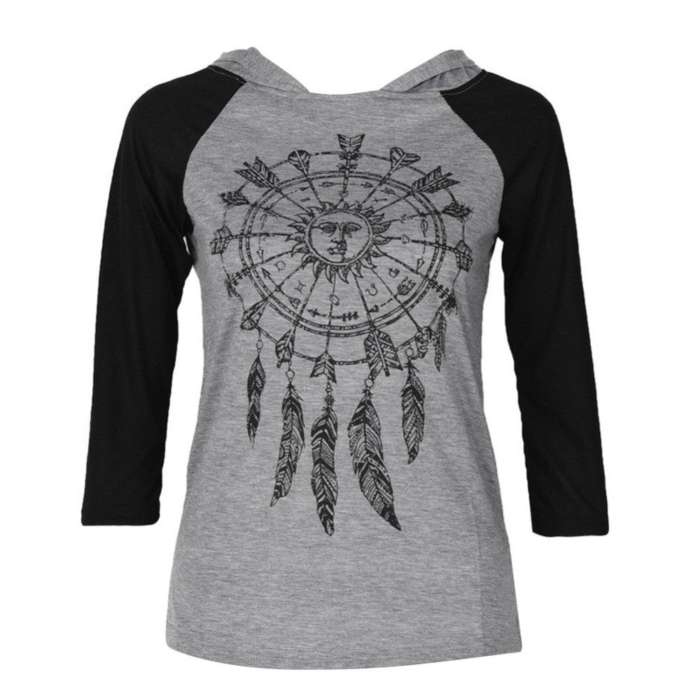 Dreamcatcher Printed Women T-shirt Hooded Patchwork Round Neck Long Sleeve Hipster Clothing ELY