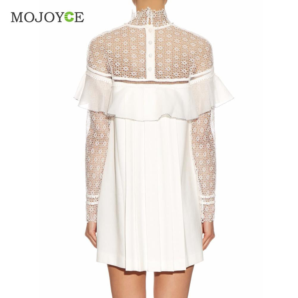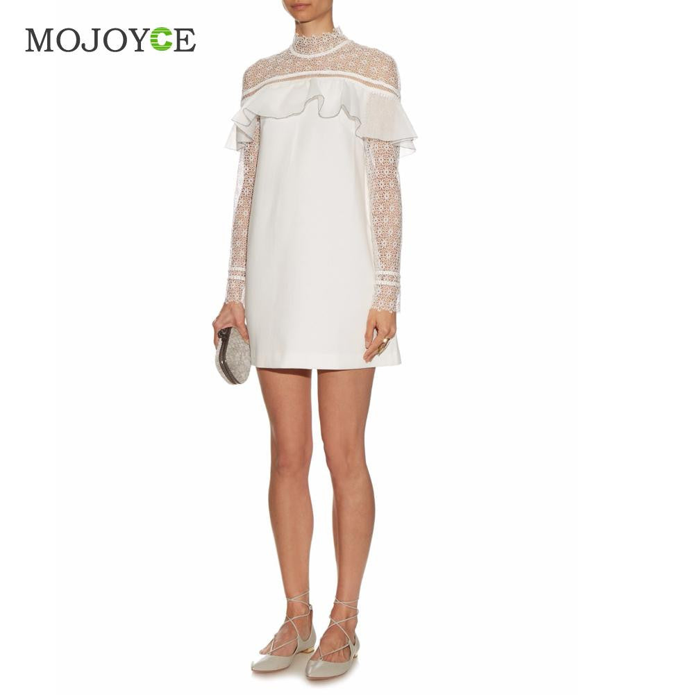 Elegant Dress Cute Mini Women Dress White Lace Ruffled Hollowout Office Dress Long Sleeve Slim OL Vestido De Festa ELY