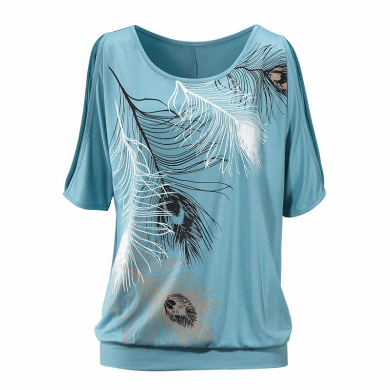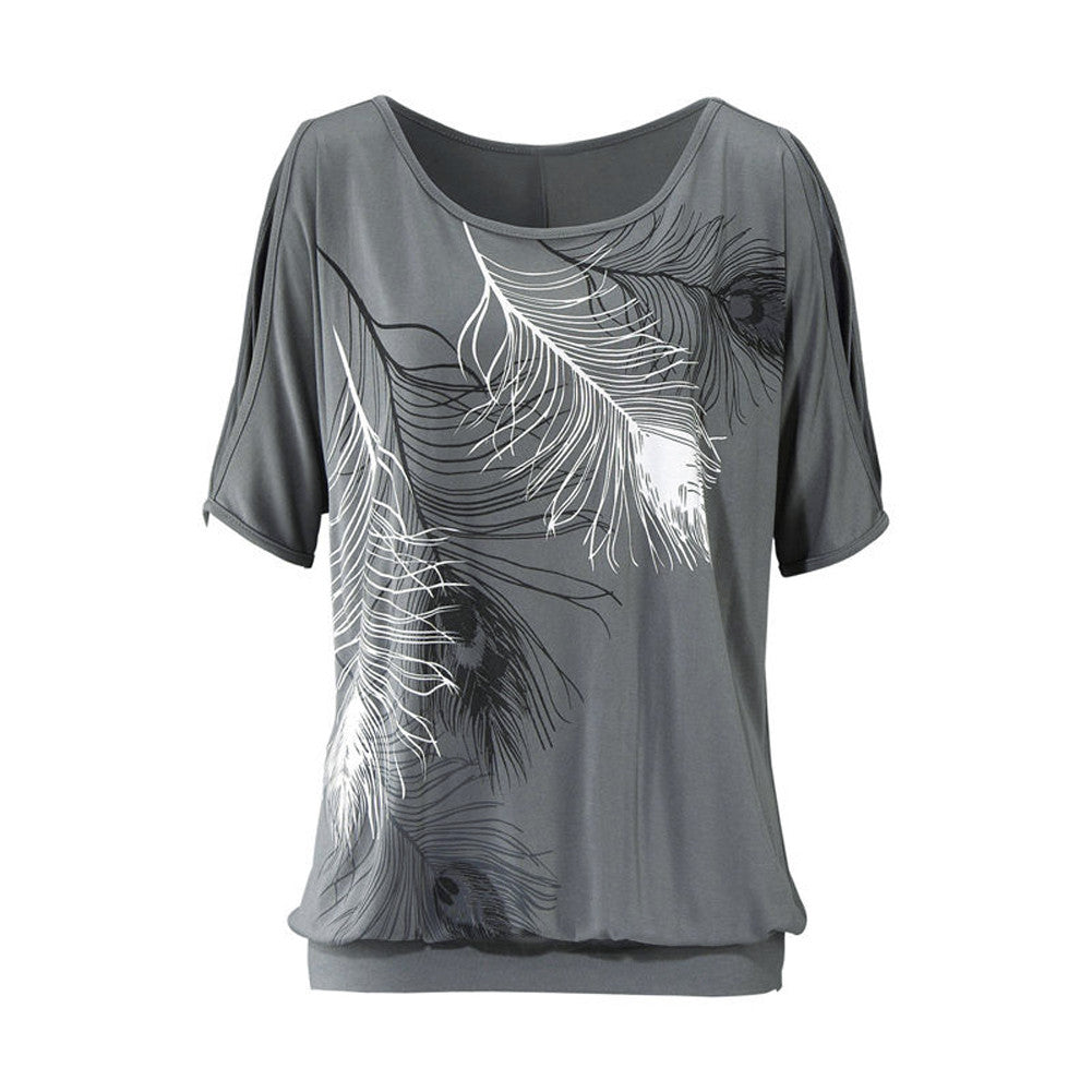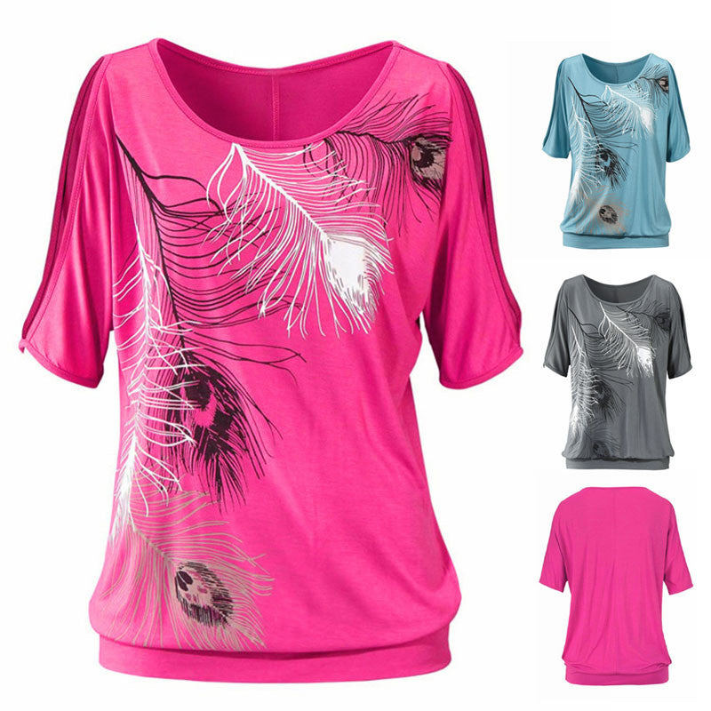 Fahion Off Shoulder Tops Feather Print Off The Shoulder Tops for Women Hollow Loose Short Sleeve Shirt O-Neck Tees Blusa S-XL ELY