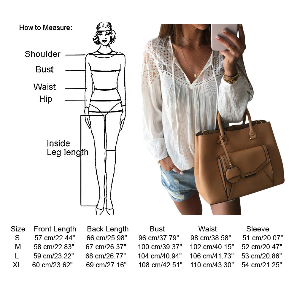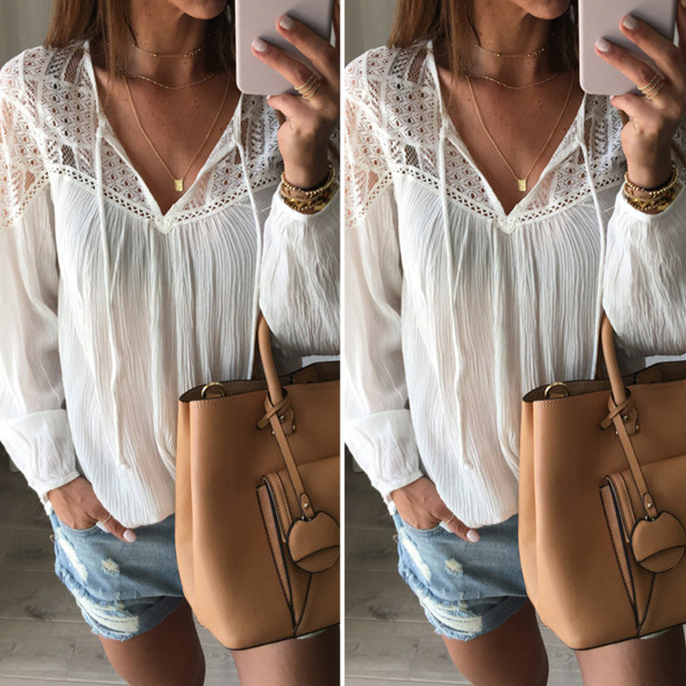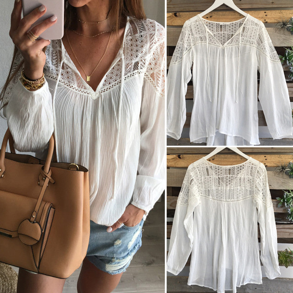 Hollow Lace Stitching Long-sleeved Top Shirt White V-Neck Women Shirts Tops 1STL ELY