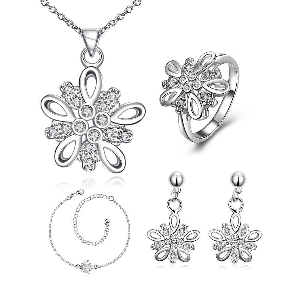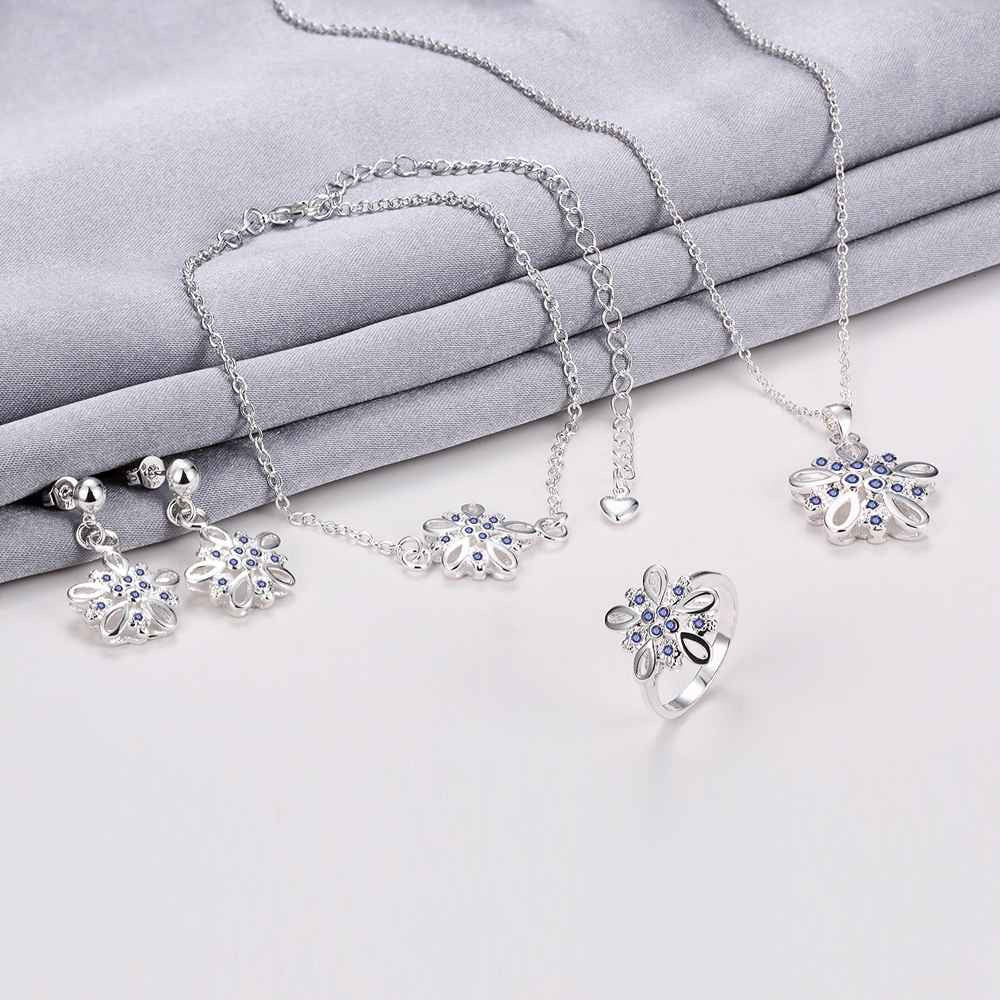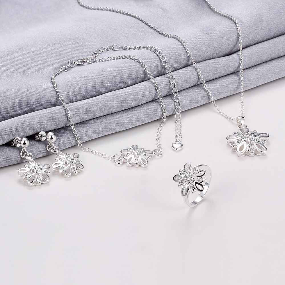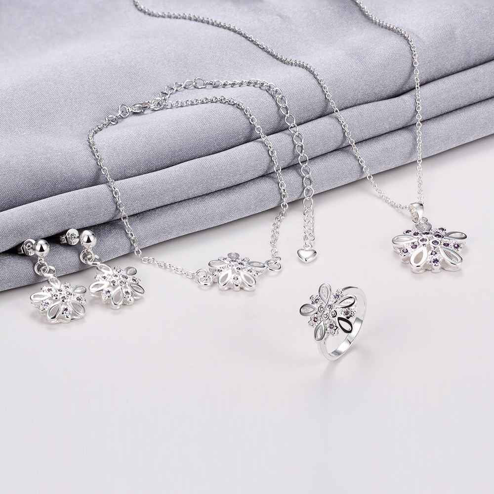Lovely silver plated stamp jewelry set Crystal flower cluster necklace + ring + earrings men jewelry ELY