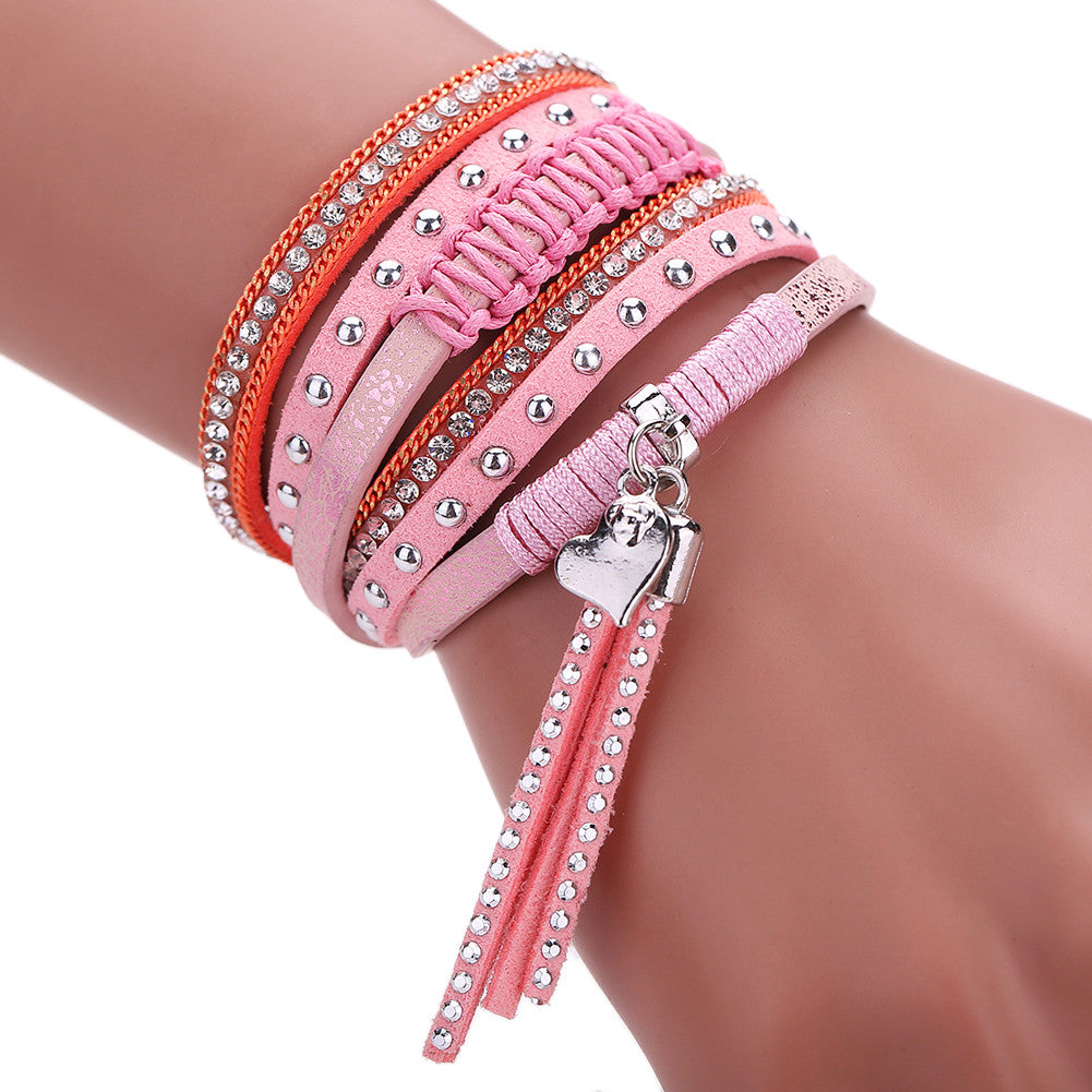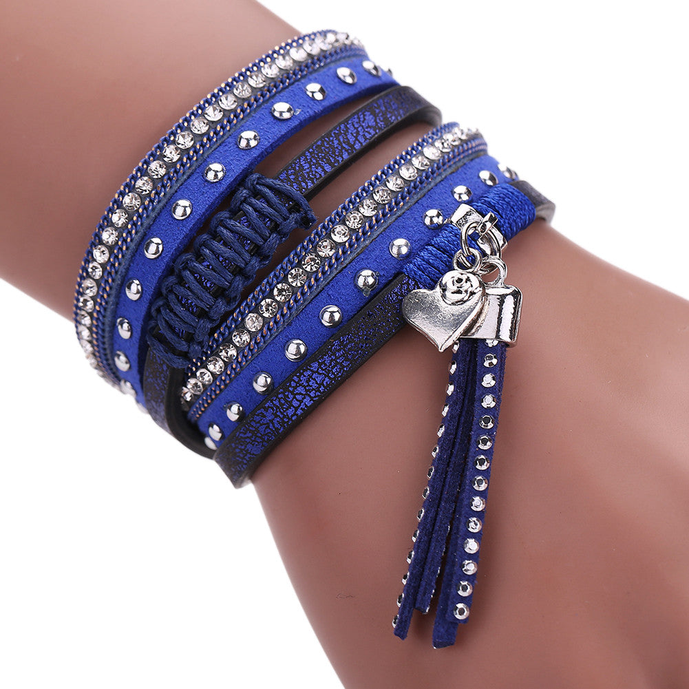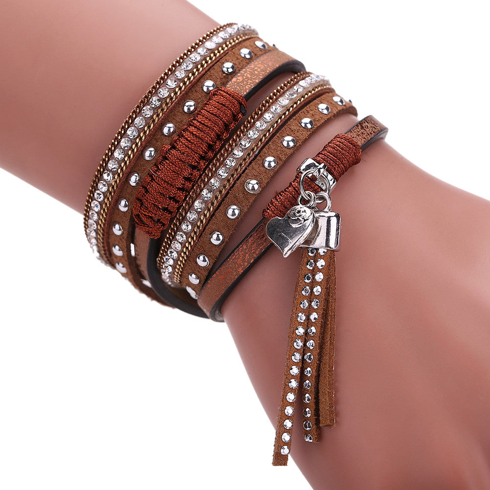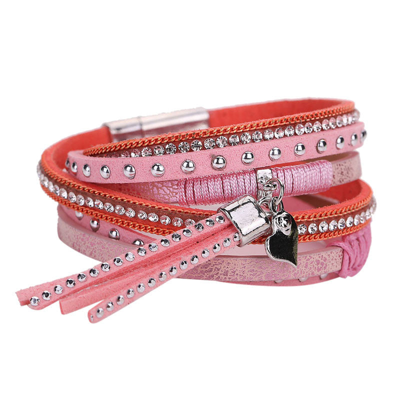 Multilayer Leather Tassels Magnet Bracelet Crystal Rhinestone Wrist Strap Jewelry Feminina Magnetic Buckle Bangles ELY