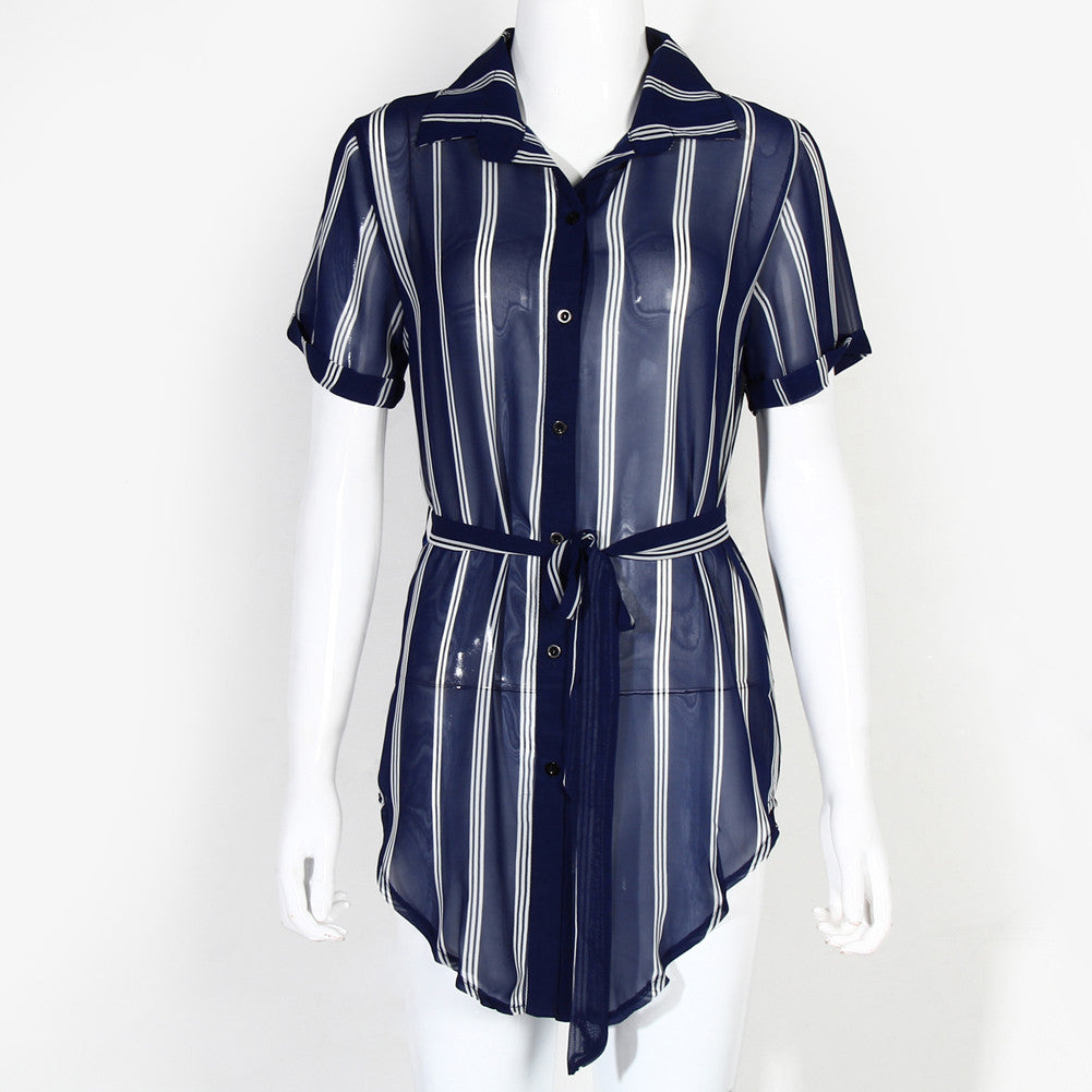 Party Women Cotton Shirt Dress Casual Beach Stripe Dress with Sashes 1STL ELY