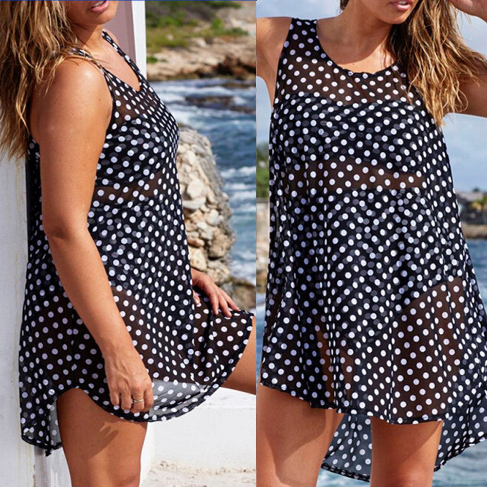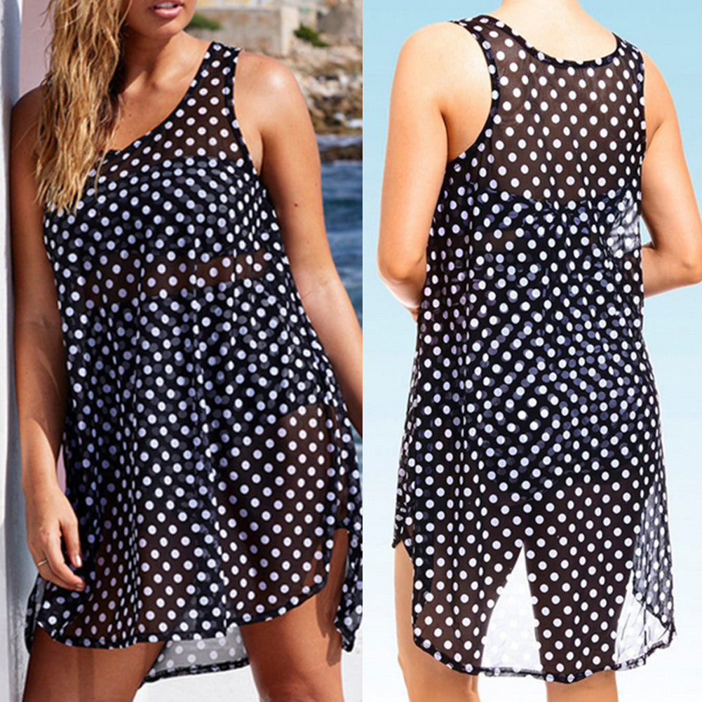 Plus Size Sleeveless Dots Printed Vest Chiffon Dress Dark Blue Beach Dress Cover Up Vestidos Dress 1STL ELY