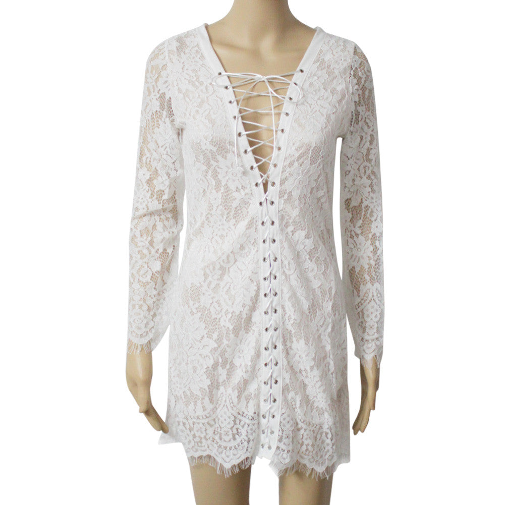 Sexy Formal Women Long Sleeve White Lace Dress Party Gown Prom Lace Bridesmaid Clubwear V-Neck Bandage Vestido De Festa 1STL ELY
