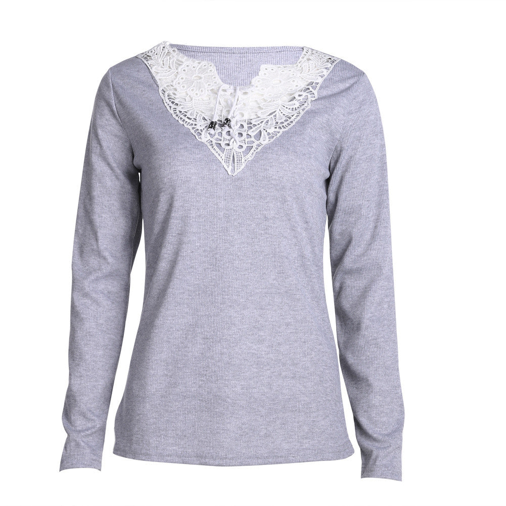 Sexy Lace Long Sleeve T shirt Screw Thread Knitted Pullover V-neck Tops Jumper Pull Femme Women Top plus size ELY