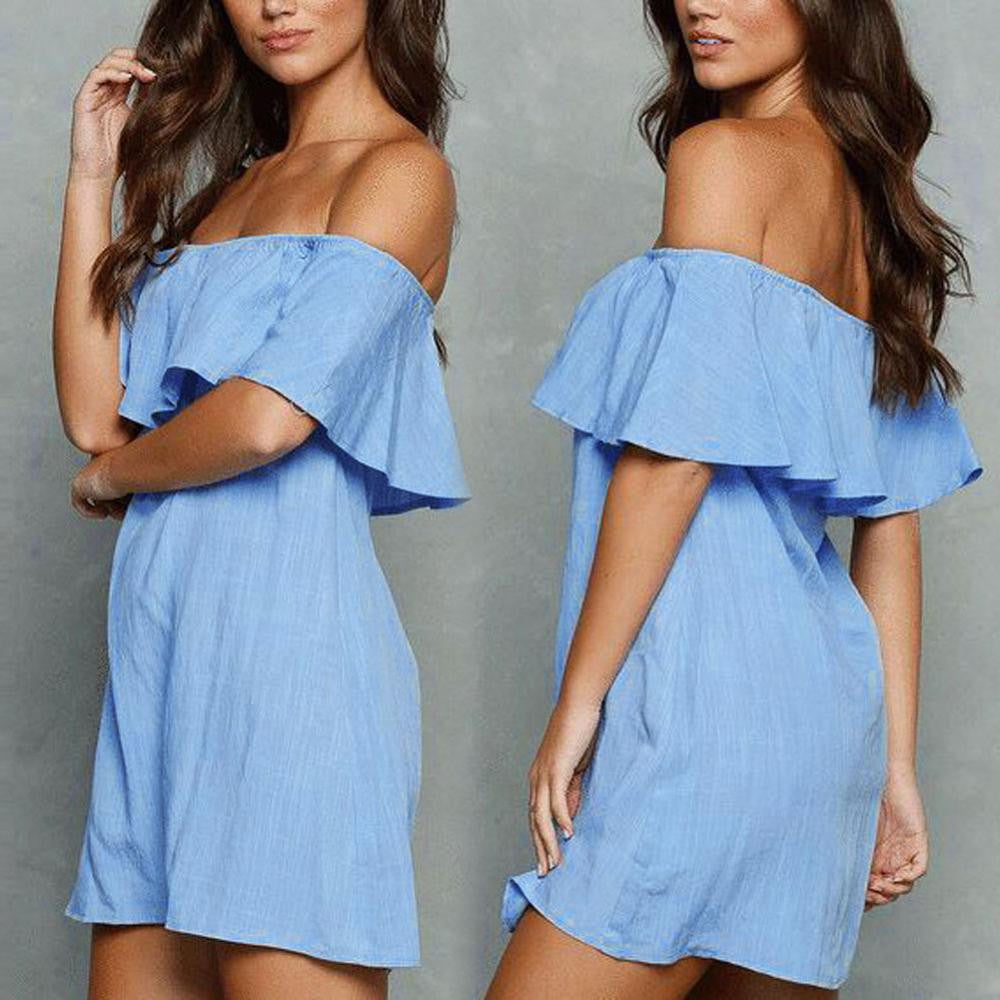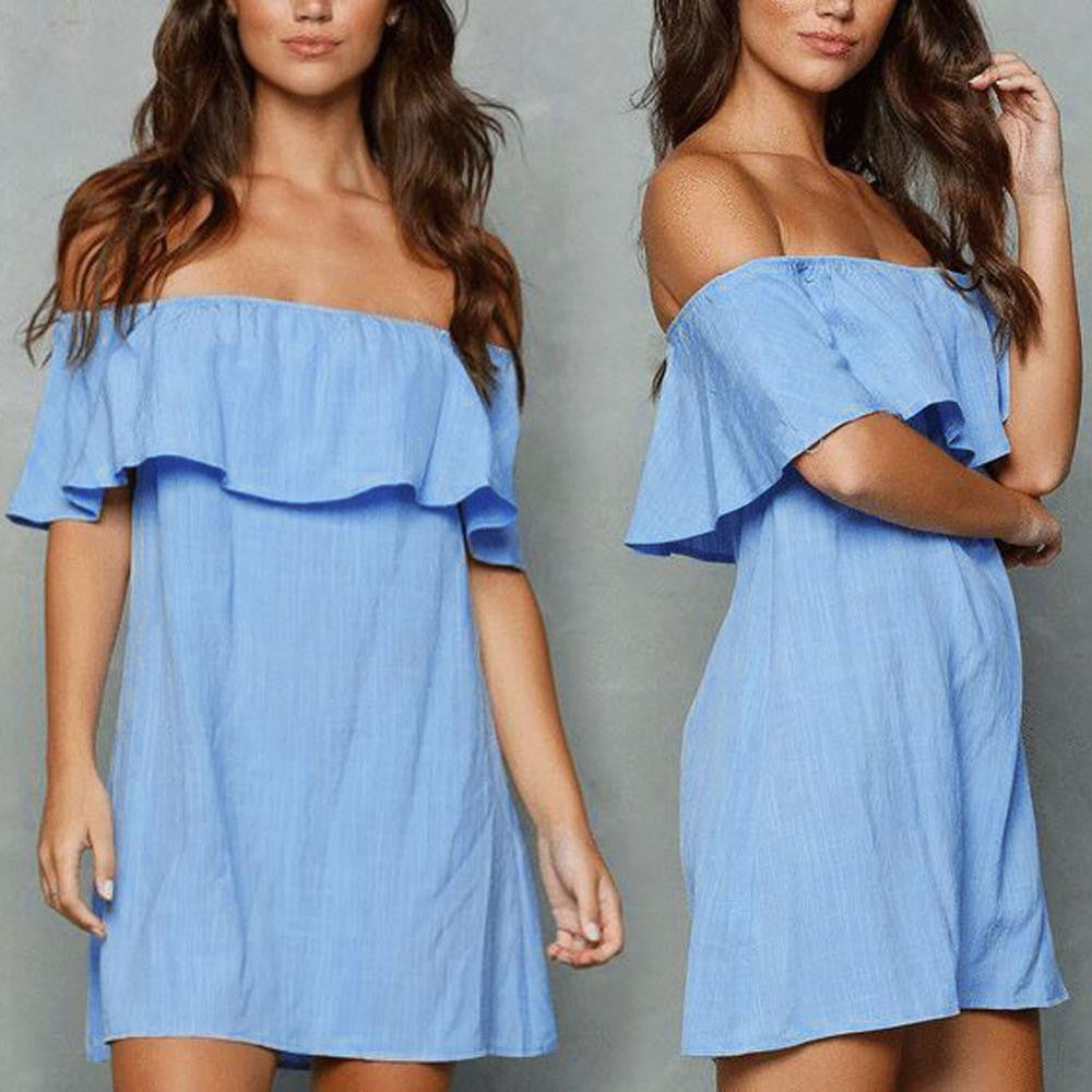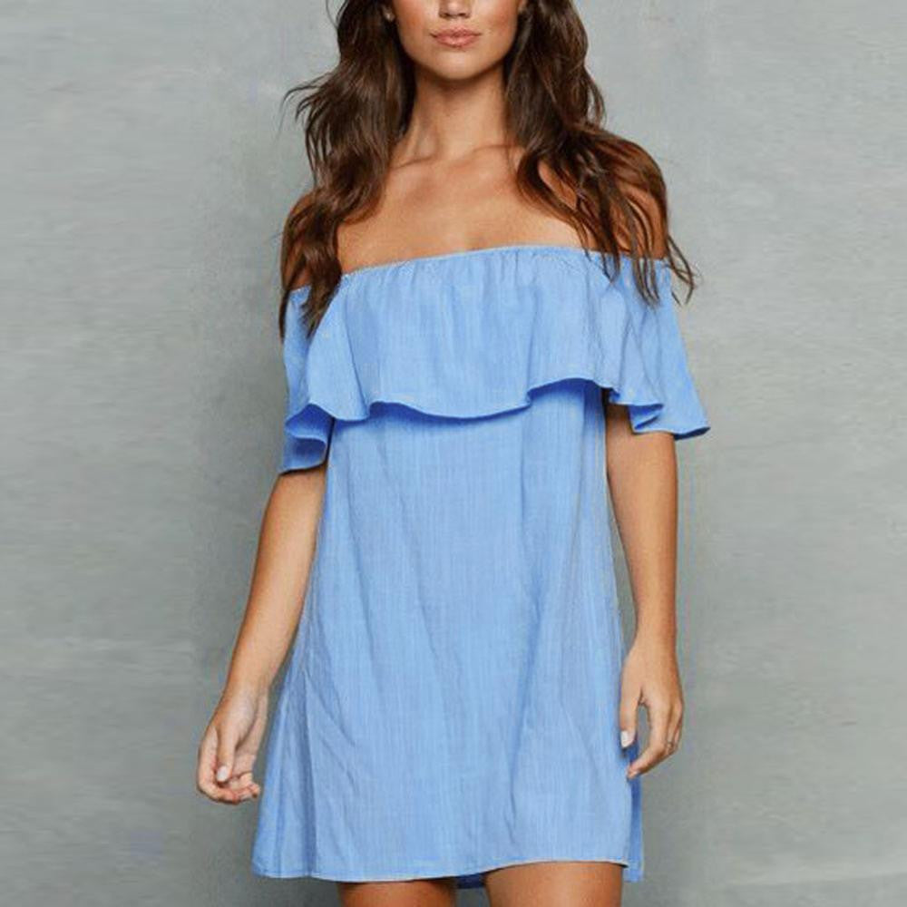 Sexy Women Dress Vestido Blue Off Shoulder Dress Short Sleeve Loose Elastic Ruffle Dress vestido de festa Plus Size ELY